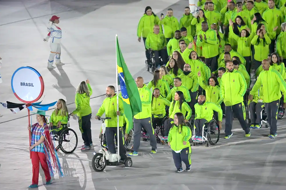 Quinta a desfilar, a delegação do Brasil teve como porta-bandeiras Claudiney dos Santos, bicampeão paralímpico do lançamento do disco, e Mariana d'Andrea, ouro na Paralimpíada de Tóquio, no Japão, em 2021. O país está em Santiago com 324 atletas com deficiência, além de dez atletas-guia do atletismo (que auxiliam os corredores cegos), três calheiros da bocha (modalidade para esportistas com elevado grau de comprometimento motor) e dois goleiros do futebol de cegos (únicos do time que enxergam).