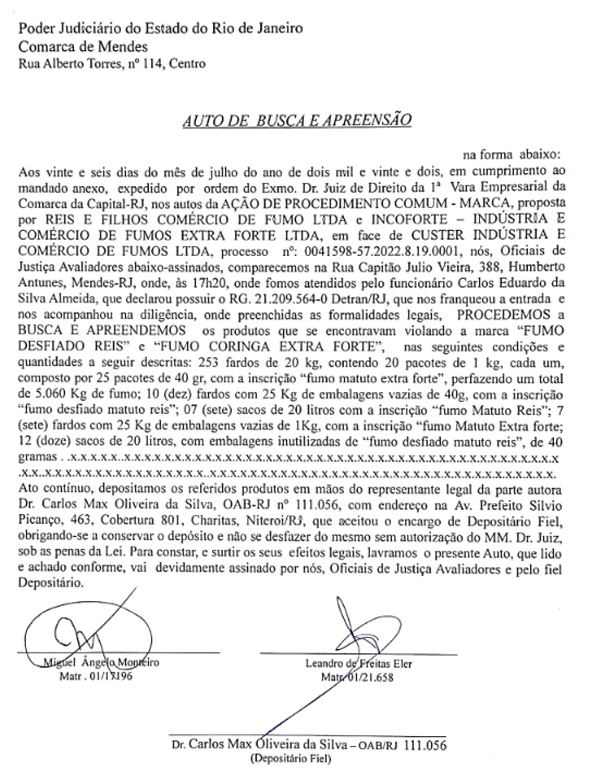 Sem conseguir citar judicialmente o empresário alvo da ação, o advogado de Almir e Altair Reis obteve nova vitória na Justiça, que desta vez determinou o cumprimento de mandado de busca e apreensão na fábrica no bairro de Humberto Antunes, onde policiais militares do 10º BPM apreenderam, no dia 15 de junho, 730 quilos de fumo desfiado com embalagens confirmando a violação da marca Fumo Desfiado Reis através da ação ilegal conhecida como trade dress.