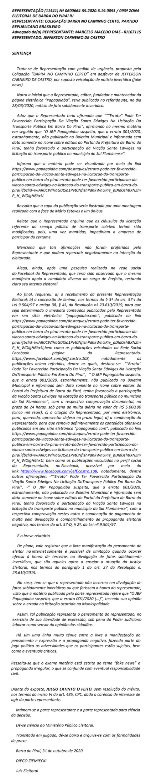 Também na tarde do dia 3 de novembro, Jeff Castro foi notificado por uma oficial de Justiça, que o Juiz de Direito Diego Ziemiecki, da 93ª Zona Eleitoral – Barra do Piraí, antes mesmo de ouvir a defesa do editor do site de notícias JBP Papagoiaba, tinha sentenciado pela improcedência da representação protocolada pelos advogados do prefeito Mário Esteves na Justiça Eleitoral.